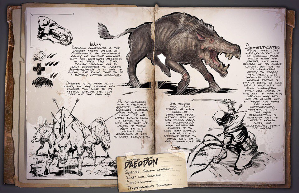 Деодон территориальное животное, охраняет место своей кормежки. Кто в это не верит – может узнать на своей шкуре. Как всеядное животное с ненасытным аппетитом , Деодон ARK Survival Evolved поедает любой корм вокруг себя и так же является неплохим охотником.
