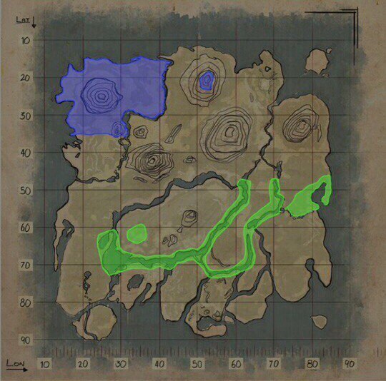 Карта ARK Survival Evolved останется прежней. Карта будет выглядеть так, синим обозначен снежный биом, зеленым болота