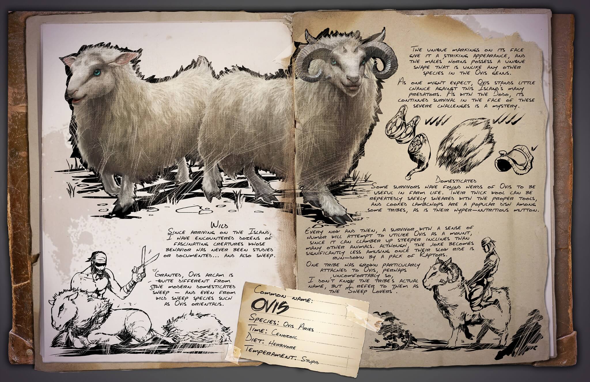 С момента прибытия на остров, я столкнулся с десятками захватывающих существ, поведение которых никогда не были изучены или задокументированными… а также овец. Конечно, Ovis aries довольно сильно отличается от современно-одомашненных овец – и даже от диких видов овец, таких как Ovis Ориенталис. Уникальные отметины на его морде придают ей яркий внешний вид, и рога самцов – Баранов ARK обладают уникальной формой, которая отличается от любых других видов рода Ovis. Как и следовало ожидать, у Овиса мало шансов против многих хищников этого острова. В принципе как и у Додо, но до сих пор остаётся загадкой как ему удалось сохранить род Овисов.