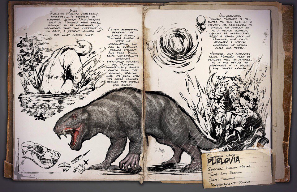 Пурловия | Purlovia в дикой природе:Пурловия – великолепное воплощение фактора неожиданности. Относится к классу – тероцефалов, когда то Пурловии, считались травоядными, но на острове АРК было обнаружено, что Пурловия на самом деле – терпеливый плотоядный охотник, обладающий огромным интеллектом. В джунглях острова – Пурловия переходит в режим спячки, закапываясь под землю или листву и может ожидать жертву длительные периоды, обходясь совершенно без пищи. Когда жертва бродя по джунглям, вдруг, натыкается на нее – Пурловия резко выпрыгивает из убежища, убивая свою жертву огромными клыками, прежде чем жертва сможет среагировать.