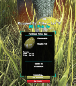 Оплодотворенное яйцо самки динозавра (Fertilized Egg) не будет развиваться и вынашиваться, если находится в инвентаре, его нужно положить на землю или выбранное, специально отведенное место. Выложенные таким образом оплодотворенные яйца – не будут портиться, при этом для его успешной инкубации потребуется поддержание температурного климата, который характерен и специален для каждого вида динозавров. Если данный температурный режим не соблюдается у оплодотворенного яйца будет падать здоровье “Fertilied Egg Health” и при достижении нулевой отметки яйцо разрушится. Все эти данные вы увидите, если посмотрите на это яйцо, так же будут показаны  данные о родителях ожидаемого потомства.